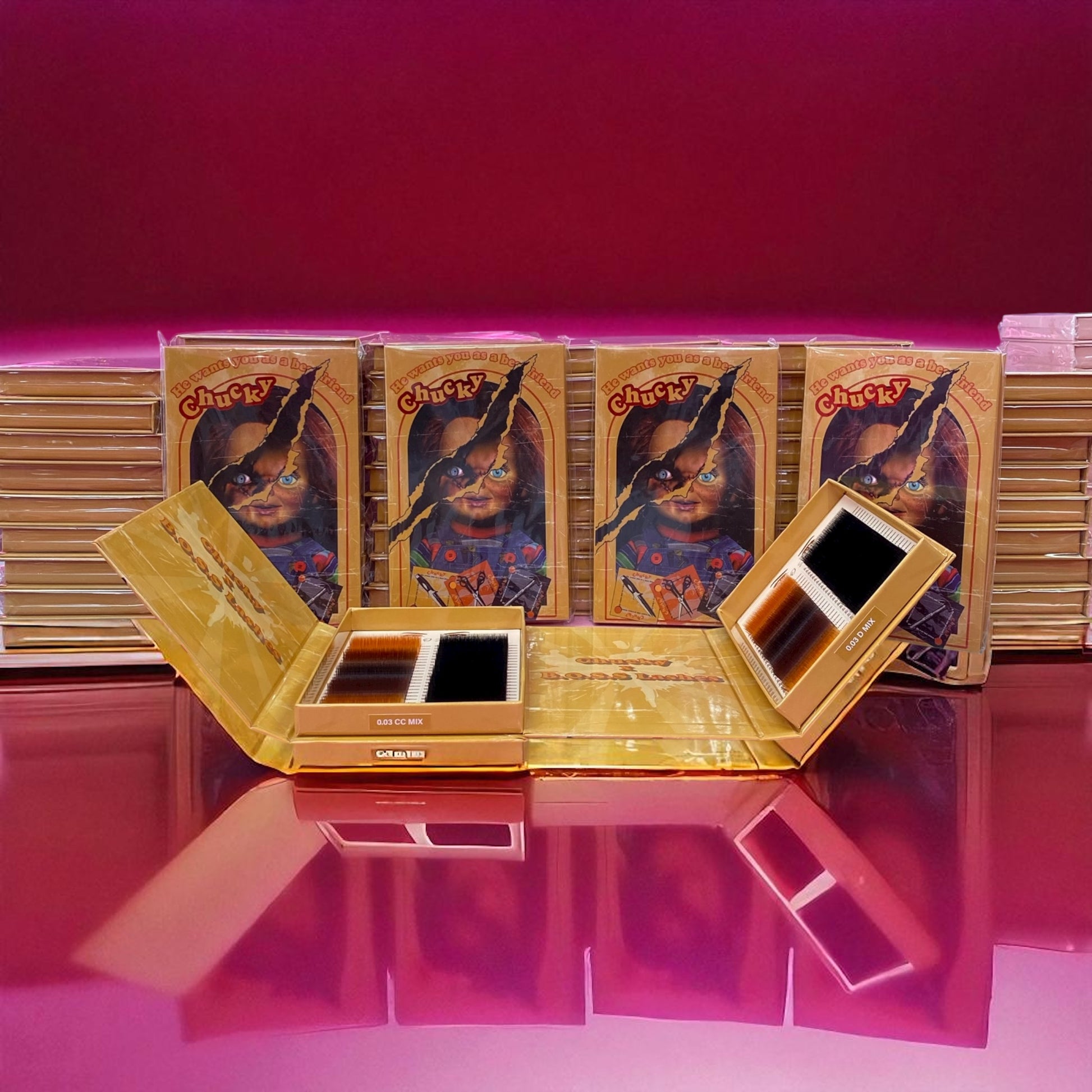 Introducing the Chucky Palette x B.O.S.S the must-have for this fall season. This eyelash extensions palette features a range of stunning colors, gradually fading into 5 shades with a white tip. Elevating your look with this chic and versatile product.This beautiful lash palette comes with black lashes and different types of browns. The tip is white, which makes it look like it fades into the light. What are you waiting for babe?
